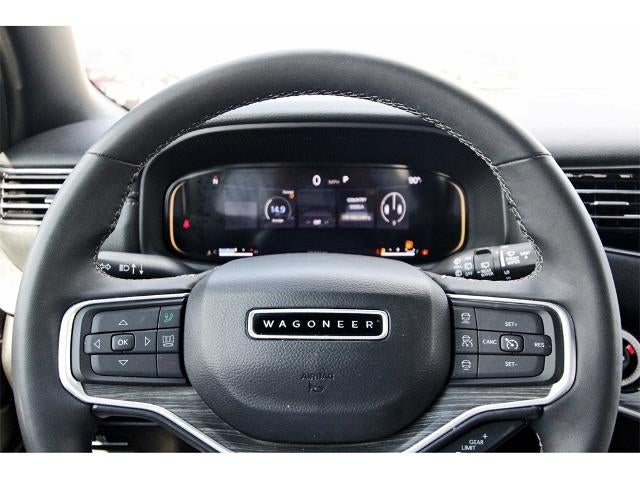 Quick Order Package 25J, 10 Speakers, 118 MPH Maximum Speed Calibration, 3.55 Rear Axle Ratio, 3rd row seats: bench, 4-Wheel Disc Brakes, ABS brakes, Adjustable pedals, Air Conditioning, Alloy wheels, AM/FM radio: SiriusXM with 360L, Anti-whiplash front head restraints, Apple CarPlay/Android Auto, Audio memory, Auto-dimming door mirrors, Auto-dimming Rear-View mirror, Auto-leveling suspension, Automatic temperature control, Brake assist, Bumpers: body-color, Compass, Delay-off headlights, Driver door bin, Driver vanity mirror, Driver's Seat Mounted Armrest, Dual front impact airbags, Dual front side impact airbags, Electronic Stability Control, Emergency communication system: Wagoneer Connect, Exterior Parking Camera Rear, Four wheel independent suspension, Front anti-roll bar, Front Bucket Seats, Front Center Armrest w/Storage, Front dual zone A/C, Front fog lights, Front reading lights, Fully automatic headlights, Garage door transmitter, Genuine wood console insert, Genuine wood dashboard insert, Genuine wood door panel insert, Heated door mirrors, Heated front seats, Heated rear seats, Heated steering wheel, Illuminated entry, Knee airbag, Leather Trimmed Bucket Seats, Low tire pressure warning, Memory seat, Navigation System, Normal Duty Suspension, Occupant sensing airbag, Outside temperature display, Overhead airbag, Overhead console, Panic alarm, Passenger door bin, Passenger seat mounted armrest, Passenger vanity mirror, Pedal memory, Power adjustable front head restraints, Power door mirrors, Power driver seat, Power Liftgate, Power passenger seat, Power steering, Power windows, Radio data system, Radio: Uconnect 5 Nav w/10.1" Display, Rain sensing wipers, Rear air conditioning, Rear anti-roll bar, Rear dual zone A/C, Rear reading lights, Rear seat center armrest, Rear window defroster, Rear window wiper, Reclining 3rd row seat, Remote keyless entry, Security system, Speed control, Speed-sensing steering, Speed-Sensitive Wipers, Split folding rear seat, Steering wheel memory, Steering wheel mounted audio controls, Tachometer, Telescoping steering wheel, Tilt steering wheel, Traction control, Trip computer, Turn signal indicator mirrors, Variably intermittent wipers, Ventilated front seats, Voltmeter, and Wheels: 20" x 9.0" Premium 2 Aluminum.